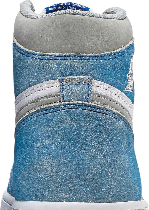 The Air Jordan 1 Retro High OG 'Hyper Royal' Sneakers for Men offer a stylish and comfortable experience. Featuring a weathered aesthetic with white leather and faded blue suede overlays, these sneakers also include neutral grey accents and OG branding elements. The standard AJ1 rubber cupsole with Nike Air cushioning provides support and cushioning for all-day wear.